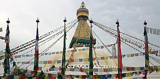 der Erleuchtung. Von der Spitze der Stupa sind jede Menge bunte Gebetsfahnen gespannt,